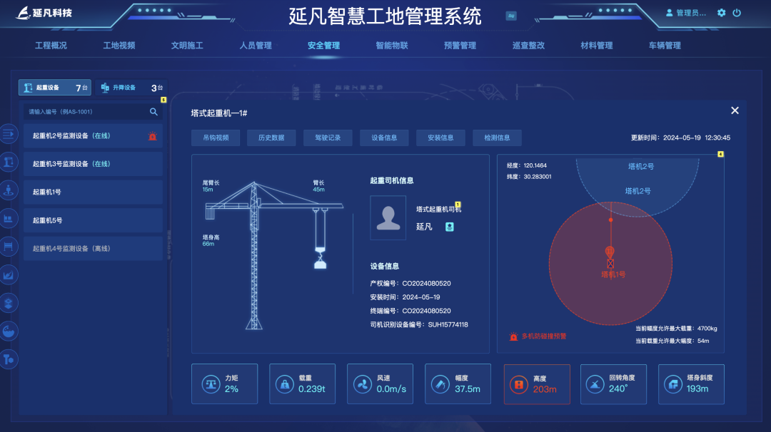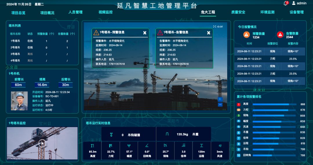 施工设备监测:塔吊、施工电梯、挖掘机等核心设备加装智能传感器,实时监测运行状态、负载、垂直度等关键参数,超限自动预警并暂停作业;