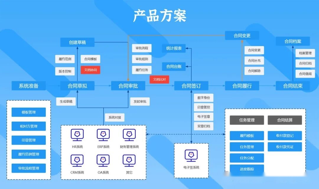 合同履行:提供履约任务管理、履约模板、收付款登记、任务管理、任务分配和进度跟踪功能。