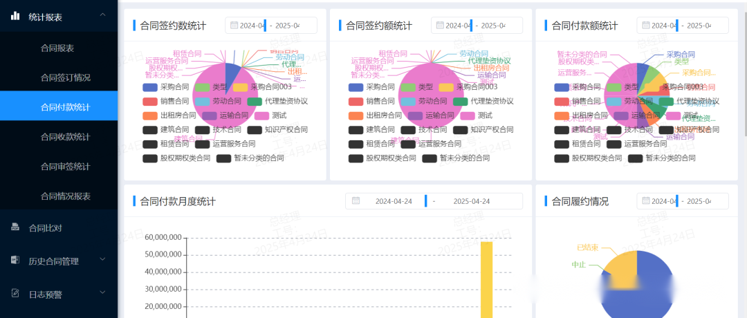 合同分析与报表:提供合同台账、统计报表、多维度报表和全文检索功能,辅助企业进行数据分析和决策。