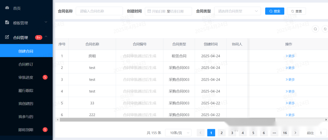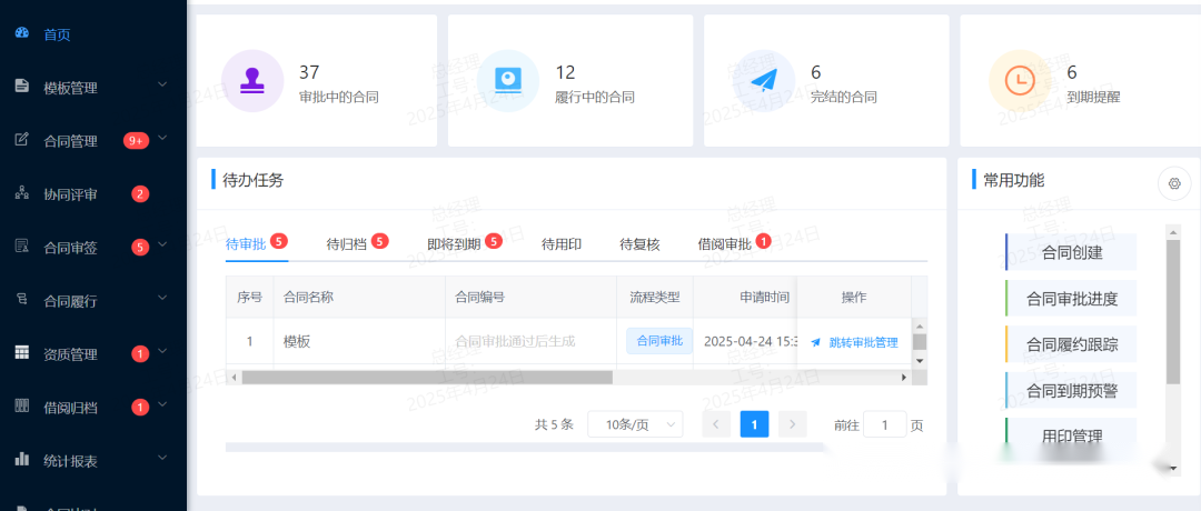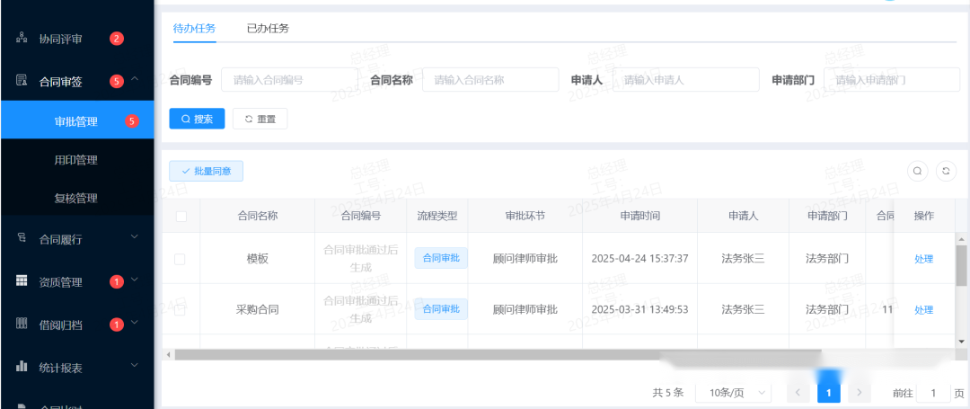 合同审批:提供自定义的审批流程和规则,支持发起审批和履约任务管理。