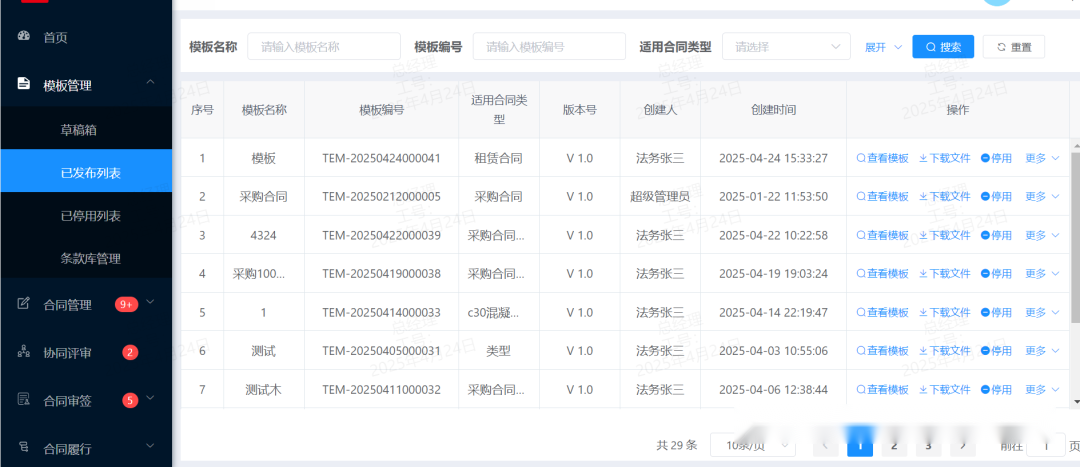 合同草拟:支持创建草稿、应用履约范例和合同模板,提供版本控制和文档协同功能。