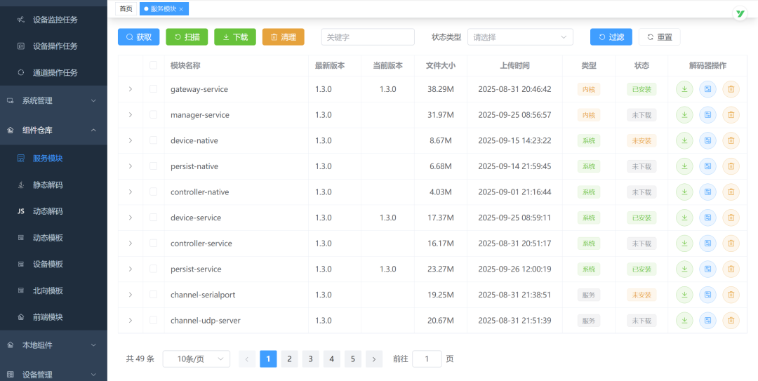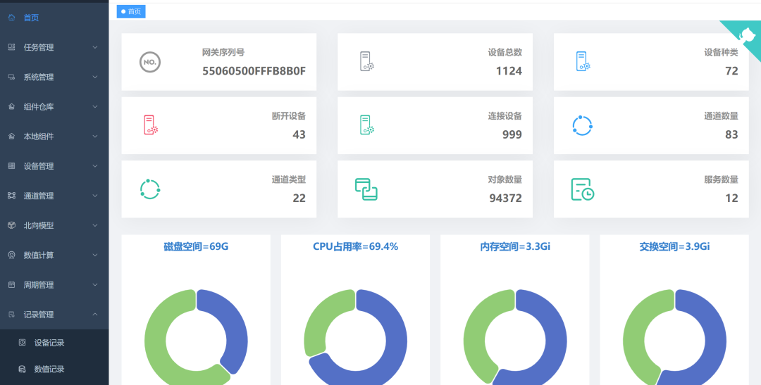 支持 JS/JSON/JAVA 解码器无限扩展设备适配,覆盖串口、MQTT、TCP 等全通讯方式;单台 4G 内存设备可管理 1000 台设备、10 万采样点,单服务内存占用仅 100M 左右,兼顾规模与低耗。