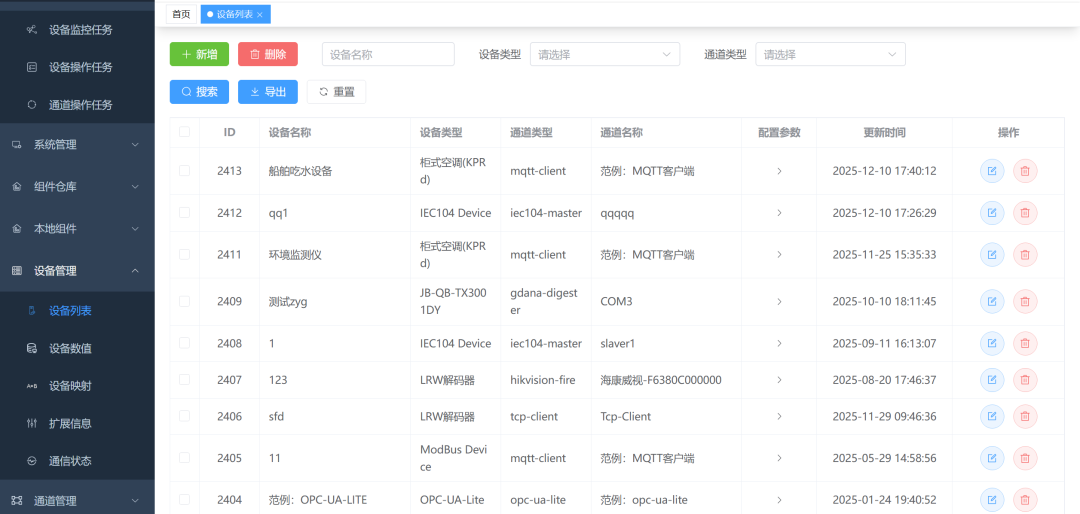 设备列表、设备数值、设备映射、扩展信息、通信状态