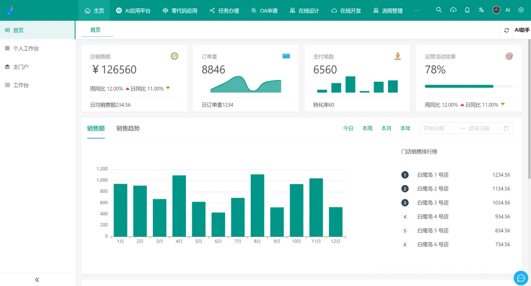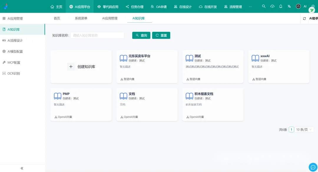 从功能覆盖维度来看,整体搭建了九大核心功能模块,分别为AI 应用开发平台、AI 知识库系统、AI 大模型管理、AI 流程编排、AI 对话支持图片、AI 对话助手(智能问答)、AI 建表(Online 表单)、AI 写文章(CMS)、AI 表单字段建议(表单设计器),既包含 AIGC 应用开发的通用能力,又打通了平台的核心业务模块,实现 AI 能力与低代码开发的无缝联动。
