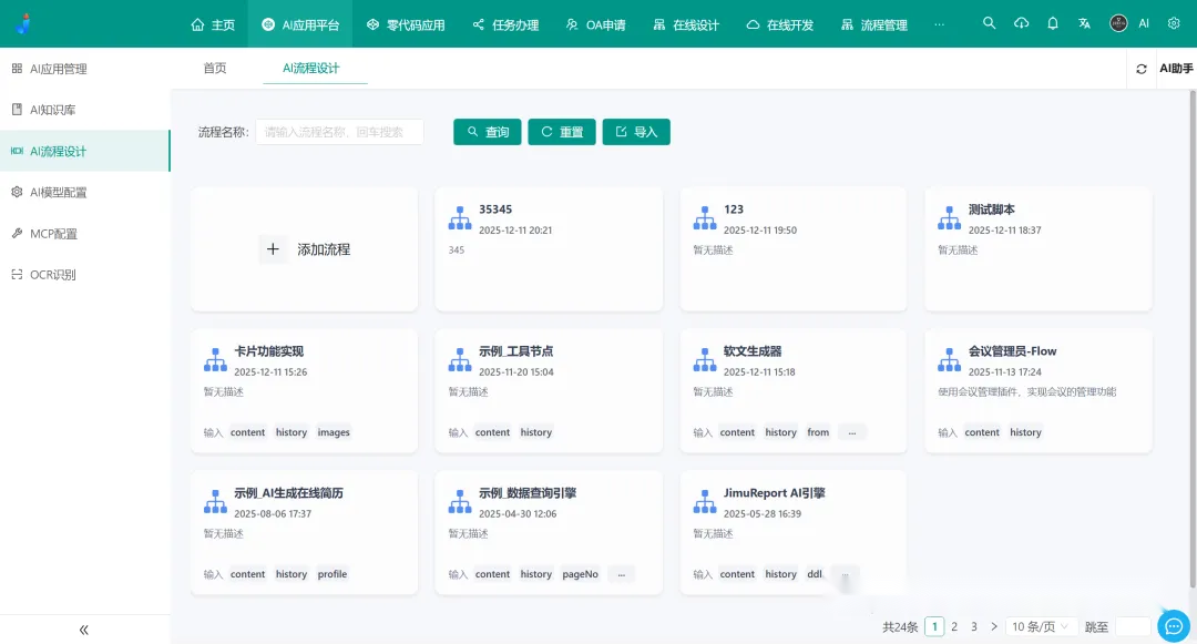 提供强大的流程设计器引擎,支持开始、结束、AI 知识库节点、JAVA 增强、HTTP 请求、脚本节点等多类型节点;可实现 AI 流程即服务,通过编排快速搭建翻译接口、接口格式转换工具、自动化文件处理流程等,还能实时查看流程运行状态。