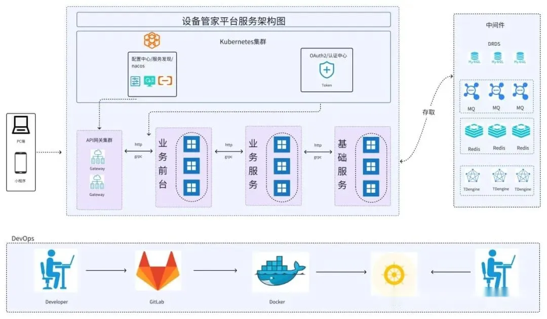DevOps流程通过GitLab、Docker和Kubernetes(K8S)实现了从开发到部署的自动化,保证系统的快速迭代和稳定运行。整体上,该架构提供了一个灵活且高效的解决方案,适合复杂的物联网应用需求。