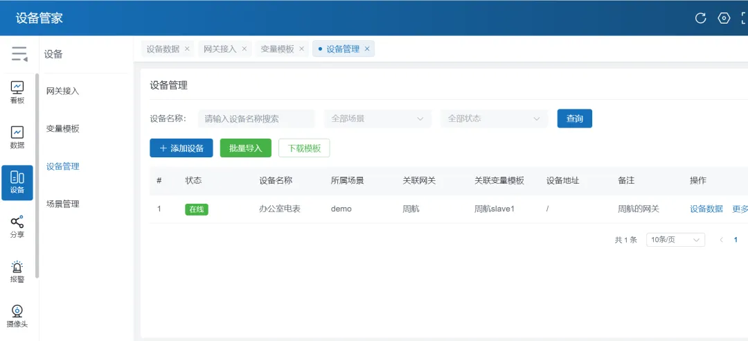 | 设备管理功能通过网关采集数据,结合变量模板统一解析,确保与现场设备一一对应,实现精准监控与高效管理。 |