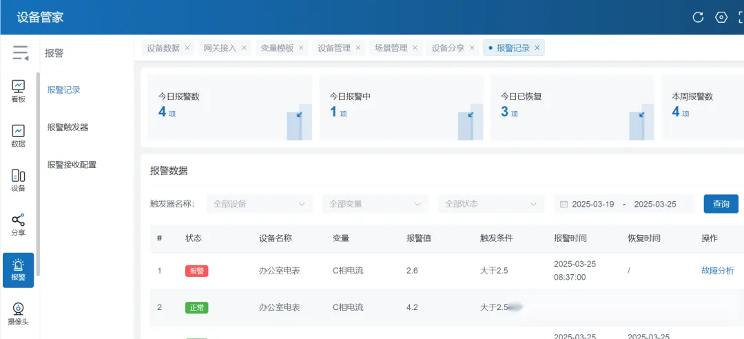 报警记录 | 报警记录实时显示设备异常信息,支持定位异常阶段的数据变化,便于快速排查问题,提升运维效率。 |