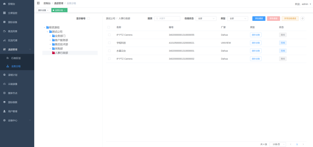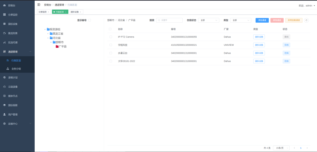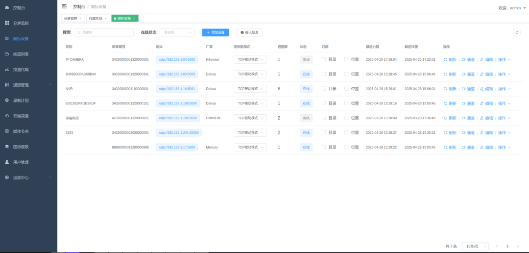 支持 GB28181 设备自动注册和手动添加,设备状态实时监控(在线 / 离线)