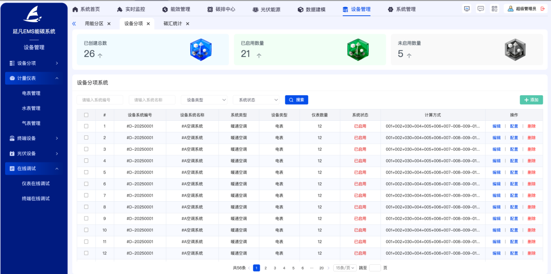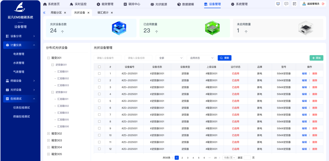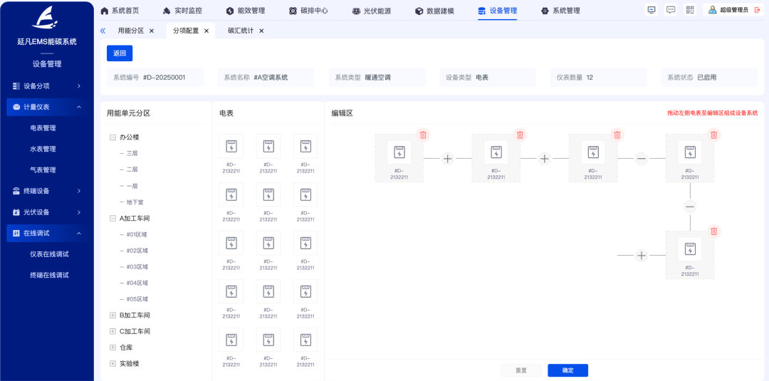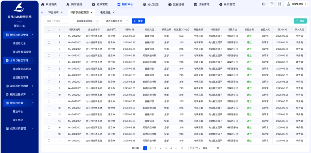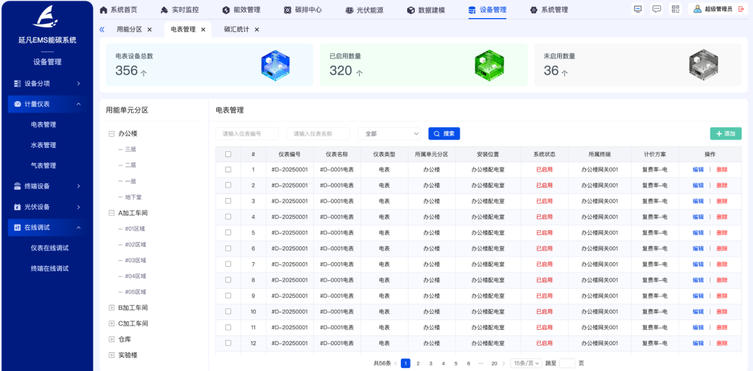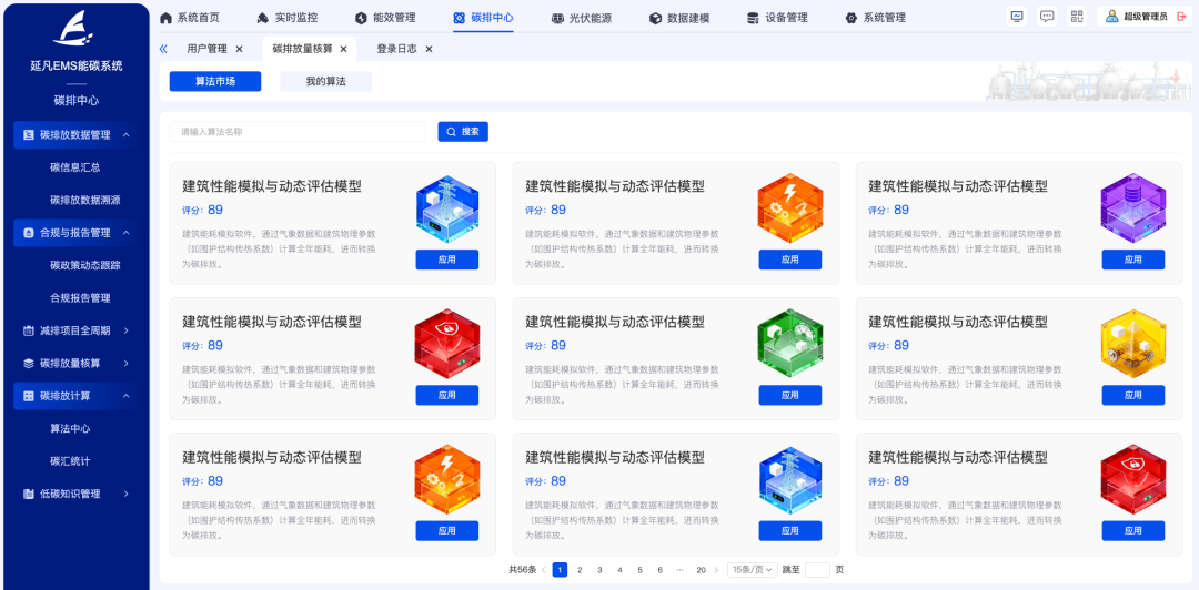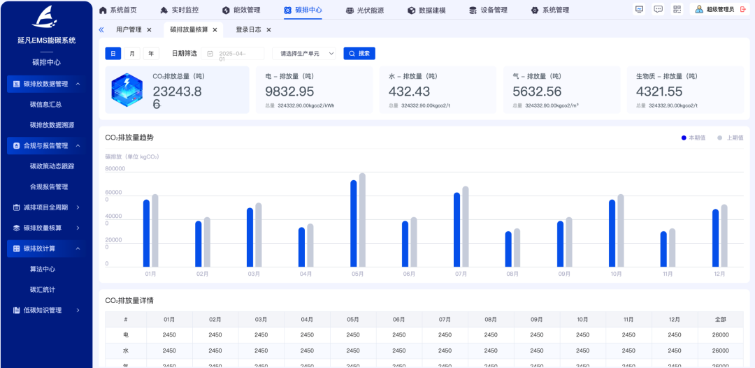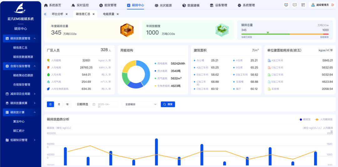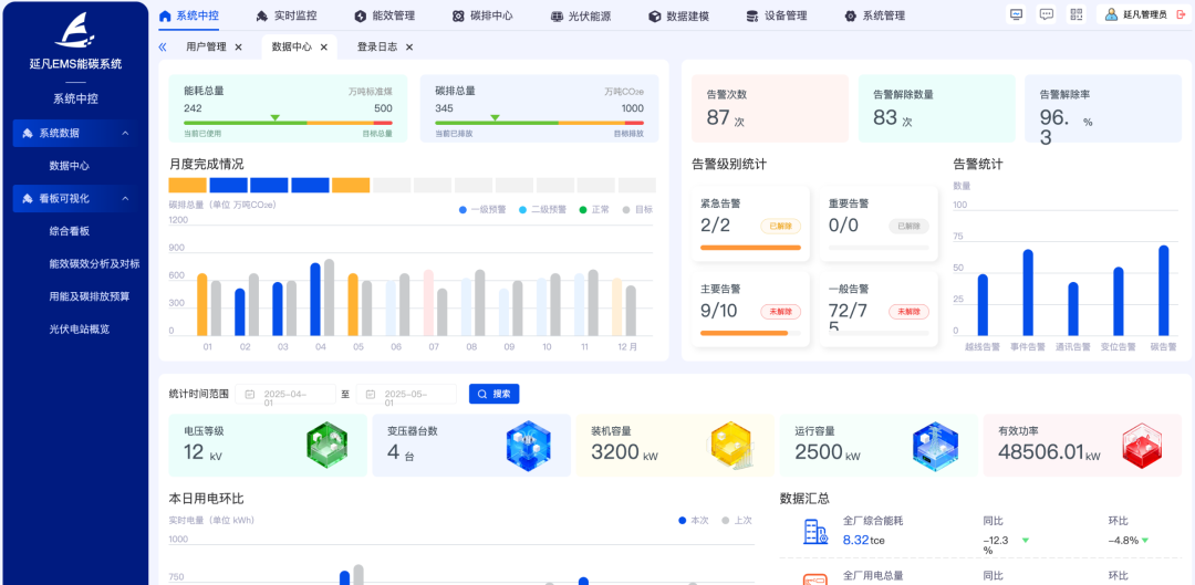 系统中控、实时监控、能效管理、碳排中心、光伏能源、数据建模、设备管理、系统管理八大核心模块协同联动,从能源数据采集到碳排核算申报,从设备智能管控到光伏储能调度,构建全链路、一体化的能碳管理体系,让能源消耗看得见、管得住、优化得了,让碳排放算得清、报得准、减得下去。