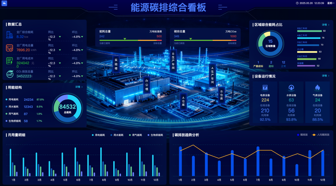 覆盖电、水、气、热、光伏、储能、生物质能等全品类能源,实现分钟级数据采集、存储与分析,打破传统人工抄表、数据滞后的弊端。