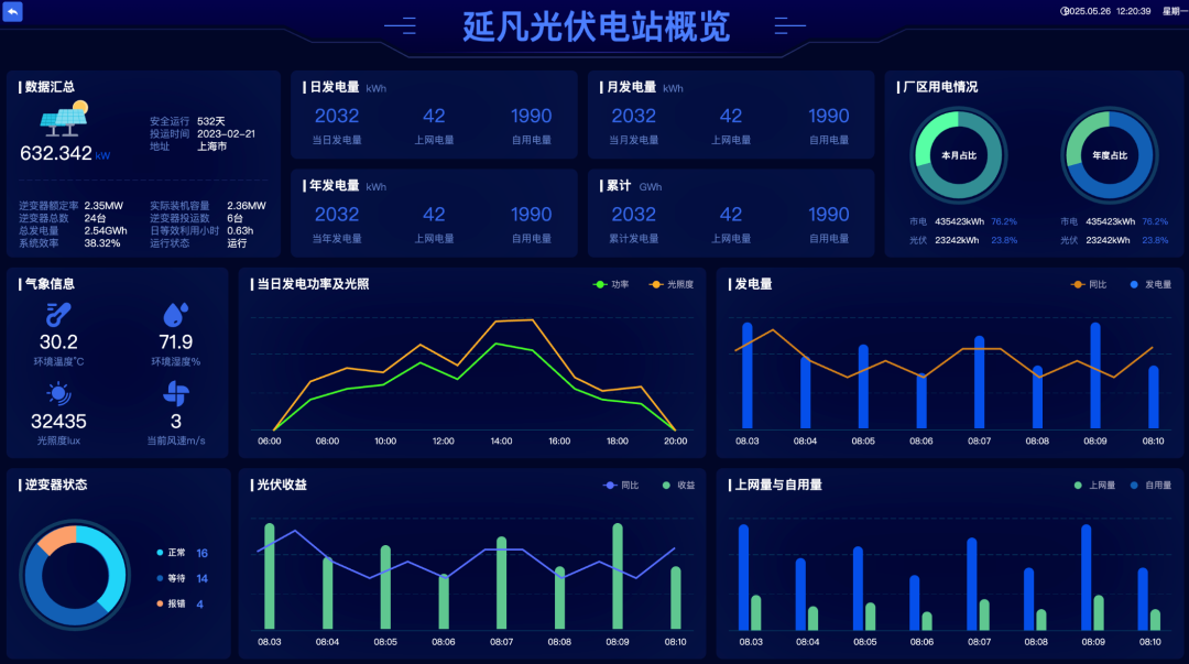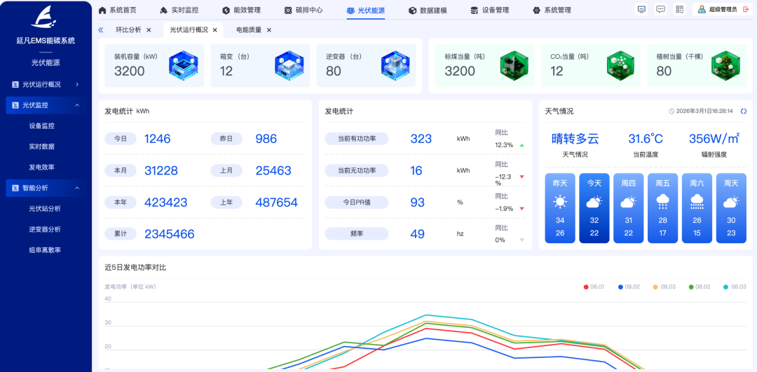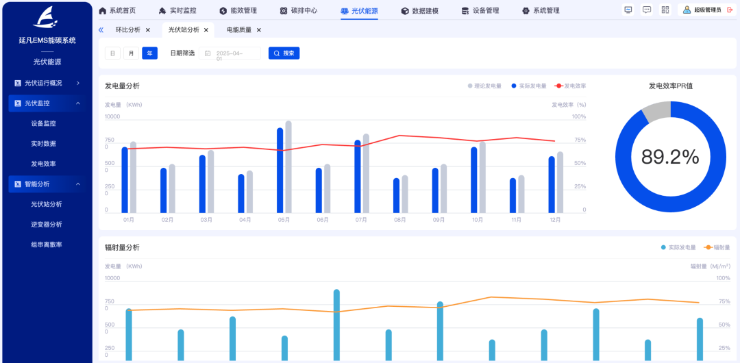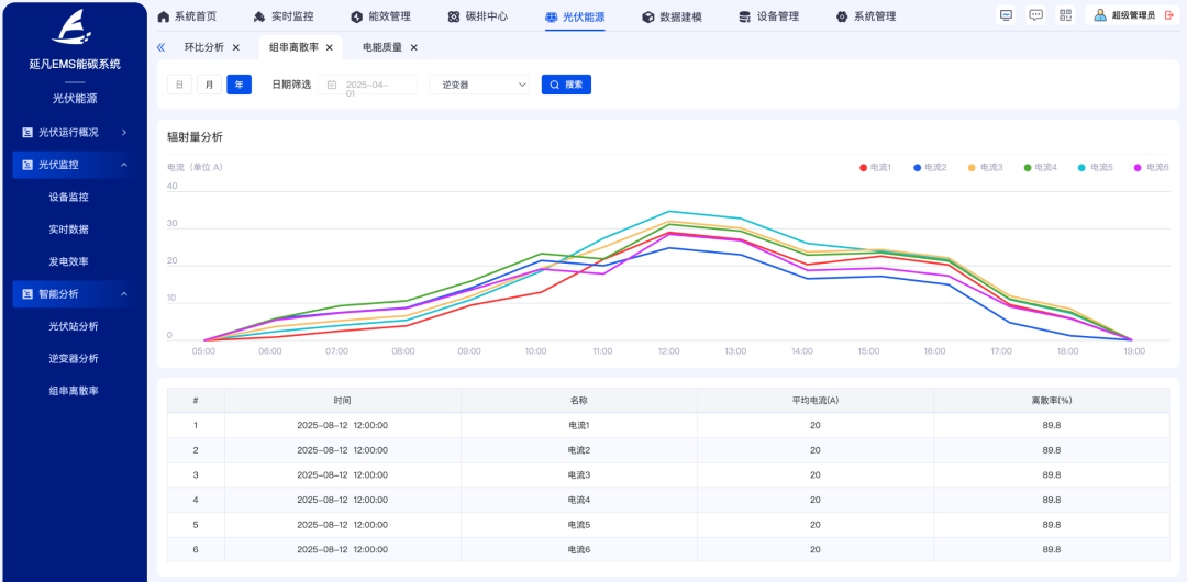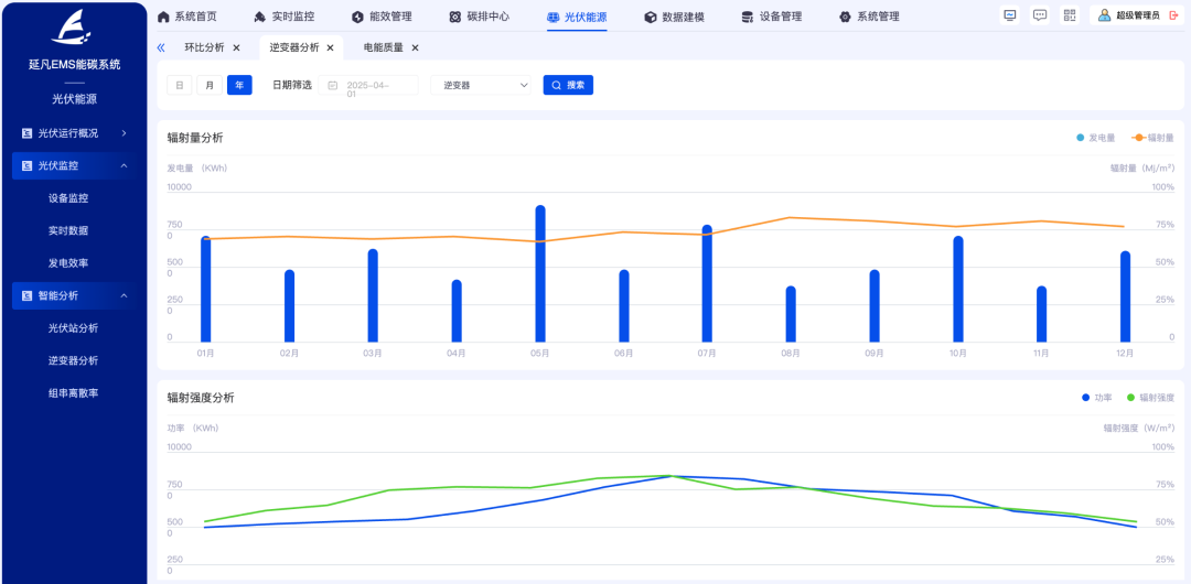 针对配备光伏、储能设备的用能单位,平台打造专业的光伏能源管理模块,实现光伏电站的实时监控、发电量预测、智能调度,精准监测逆变器、汇流箱、箱变等设备的运行状态,分析发电效率、组串离散率、辐射量等核心数据,让光伏发电情况一目了然。