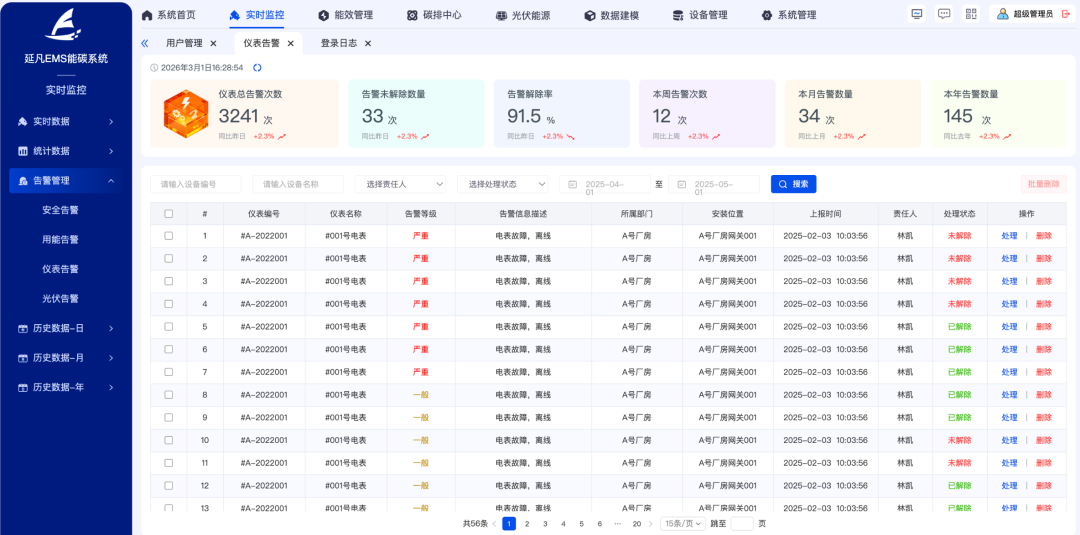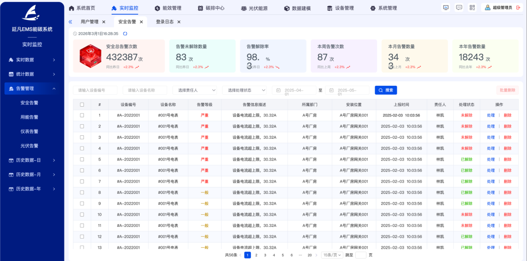 平台搭载完善的异常预警体系,针对能耗突增、设备故障、功率越限、仪表离线等情况实现实时告警,支持短信、APP 推送等多种告警方式,告警信息包含设备编号、故障原因、安装位置、责任人等详细内容,支持远程运维、线上派单、线下处理、闭环跟踪,实现告警问题的快速响应与解决,有效避免因设备故障导致的能源浪费与安全隐患,让设备运行更稳定,能源利用更高效。