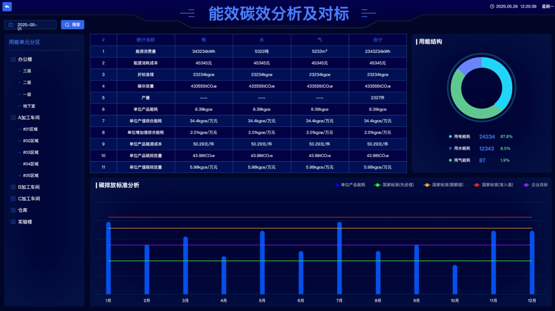 支持按区域、部门、设备、时间多维度拆分能耗数据,自动生成 EUI、单位产品能耗、单位产值能耗等核心指标,让每一度电、每一方水、每一方气的消耗都可追溯、可分析。