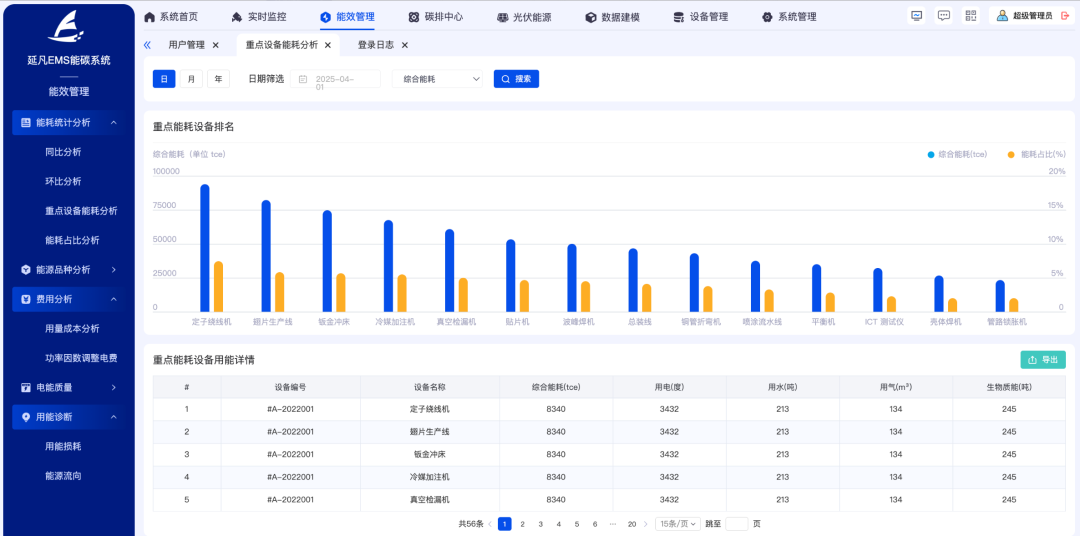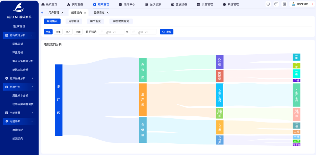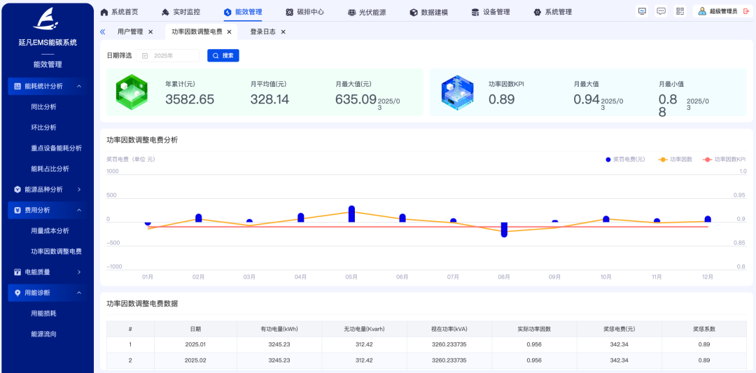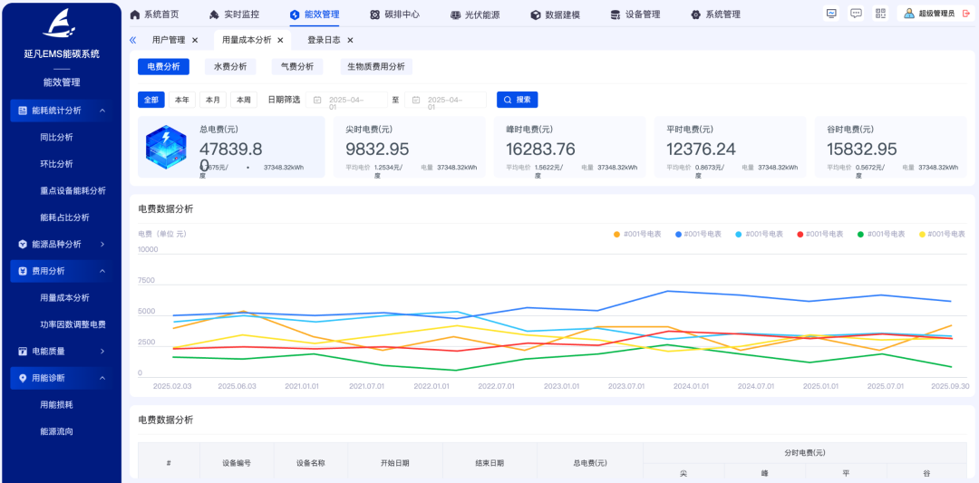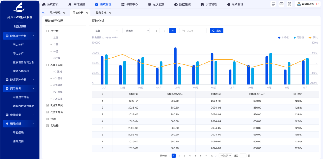同时,平台支持能耗同比、环比分析,重点设备能耗精准监测,功率因数调整电费分析、电能质量诊断、用能损耗分析等功能,一键生成能耗统计报表,清晰呈现能源消耗规律与浪费点,为能源优化提供精准的数据支撑。