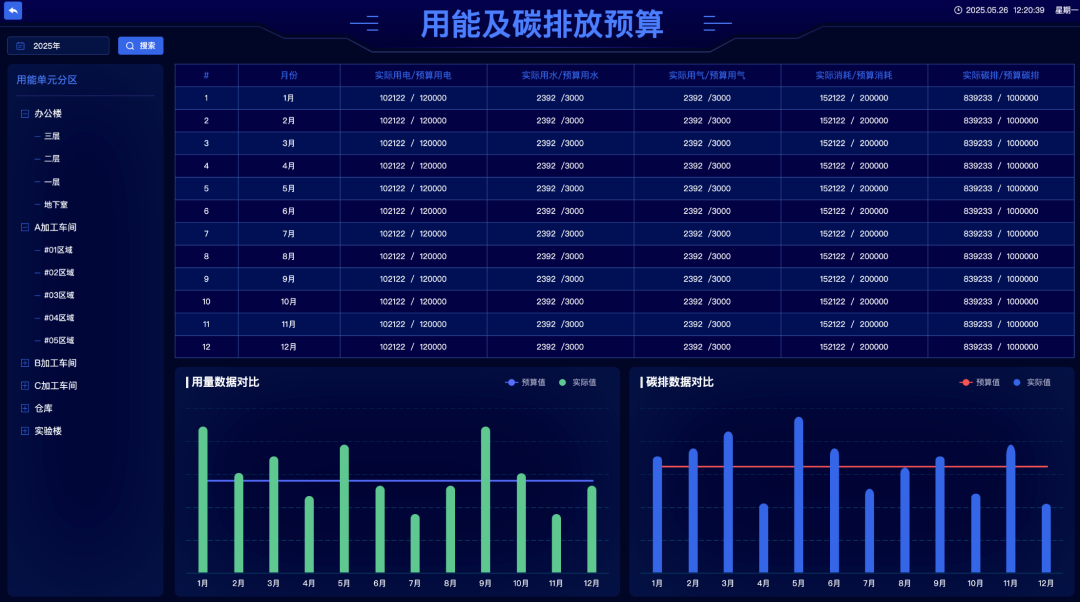 打开EMS能碳综合管理平台,综合看板一目了然:能耗总量、碳排总量实时更新,目标值与当前值清晰对比,告警次数、解除率、级别统计一键查看;月度完成情况、能碳趋势分析、用能预算执行度直观呈现,电、水、气、光伏等各类能源数据实时汇总,变压器、逆变器等关键设备运行状态精准监测,厂区、楼宇、车间各区域用能占比一键穿透,让管理者对单位能碳情况做到心中有数、决策有据。