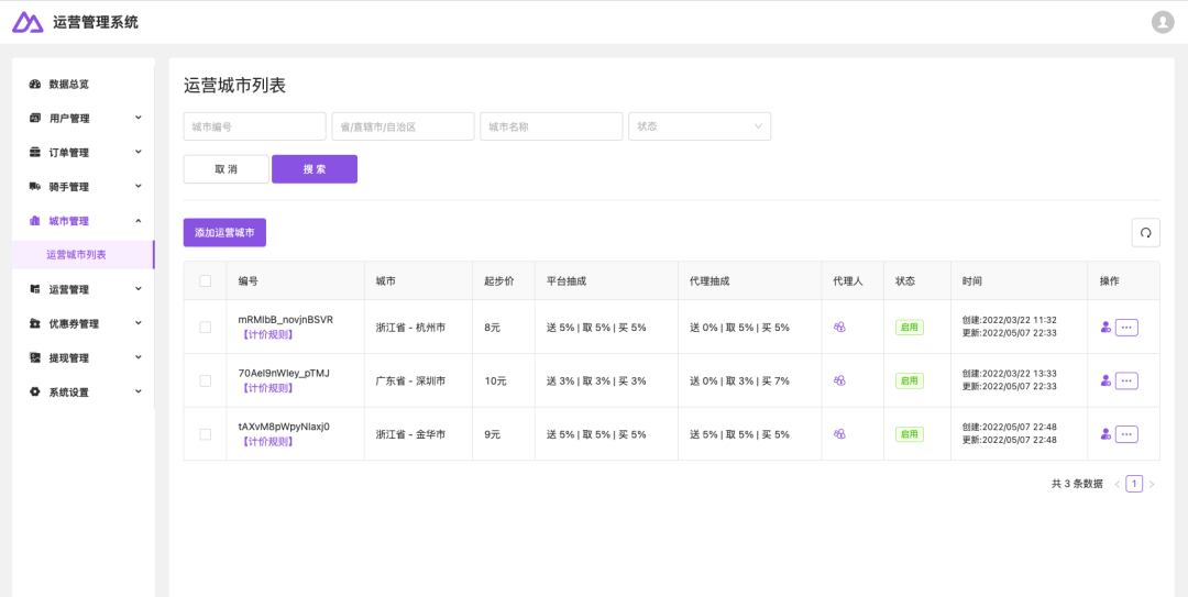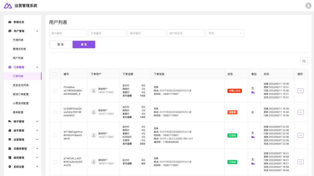 核心管理:用户管理、骑手管理、订单管理、城市管理、代理管理