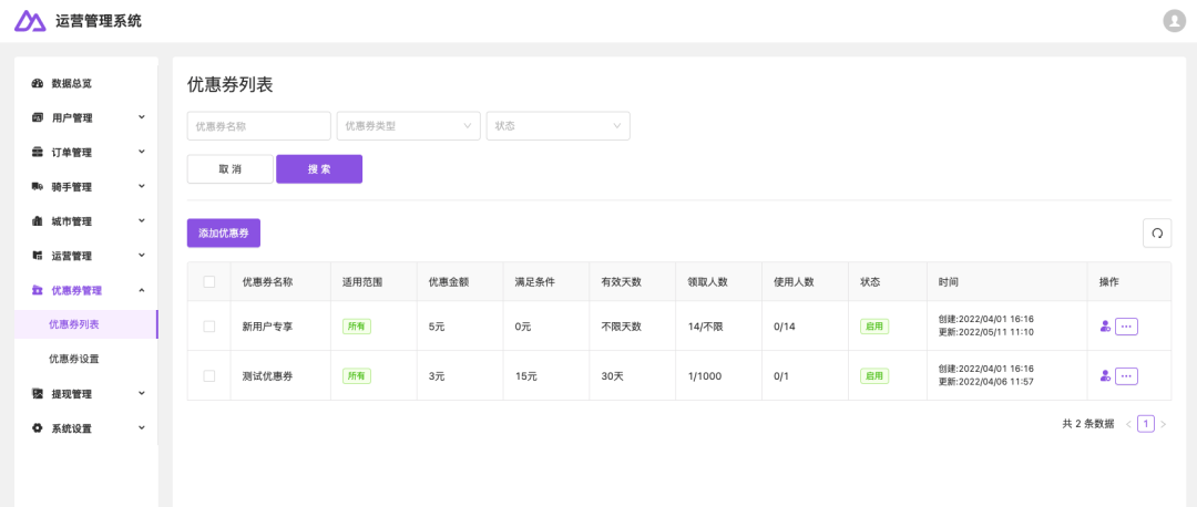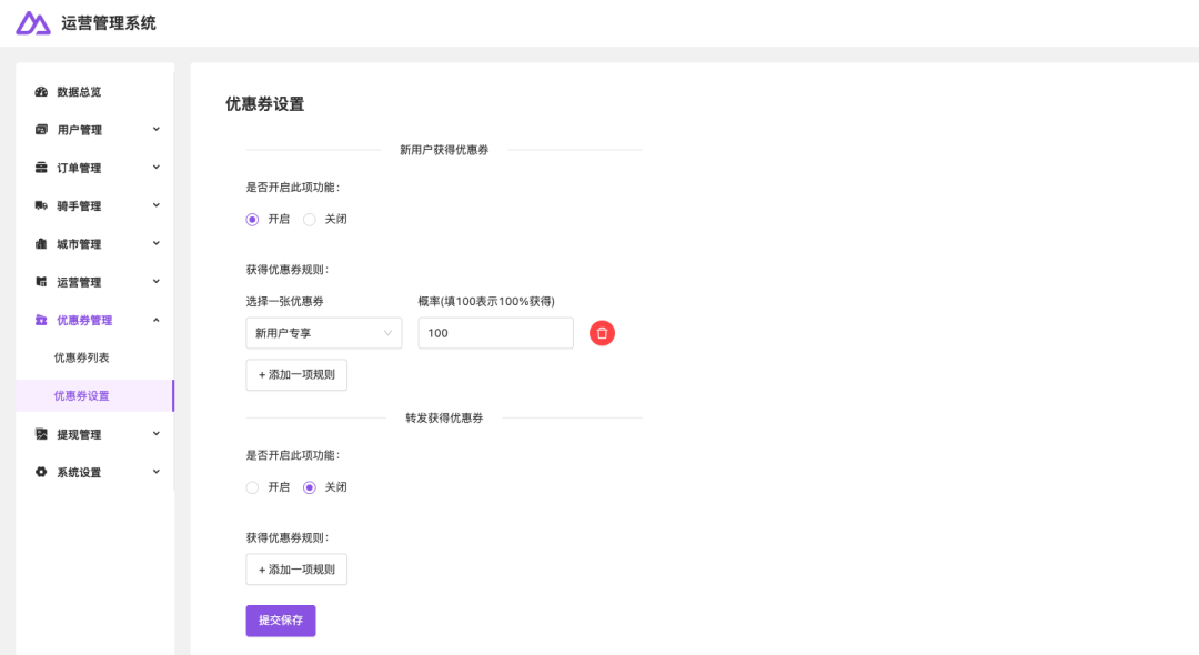 运营配置:优惠券管理(新用户专享、满减券等)、计价规则设置(距离 / 重量 / 时间段加价)