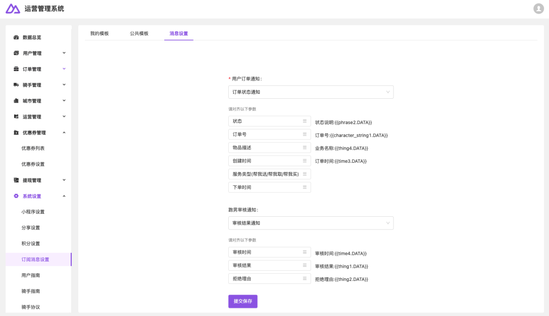 系统设置:小费选项配置、取消订单配置、订阅消息设置、分享设置