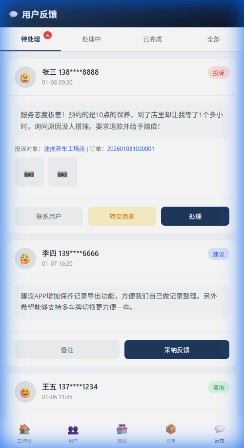 用户投诉和建议处理中心,分类显示反馈内容,支持回复和状态标记。