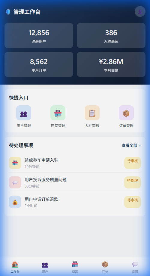 │ 工作台 │ 实时数据概览、待办事项提醒 │