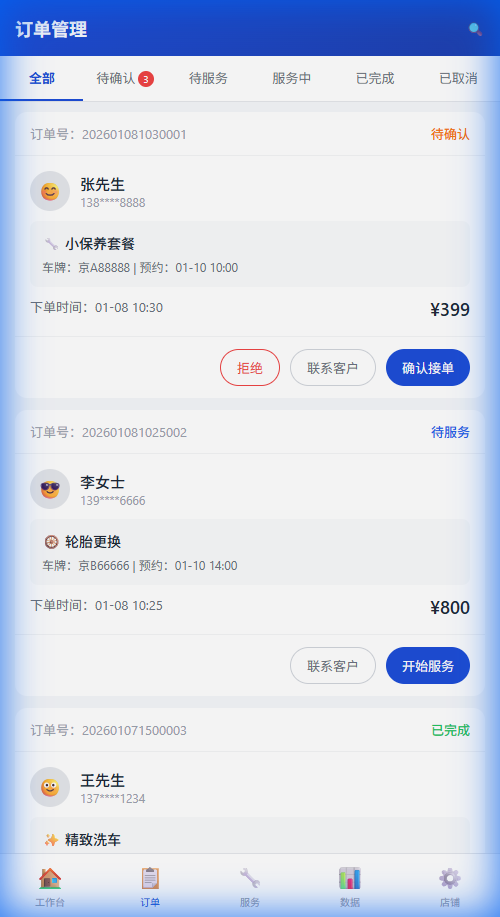 商家订单列表,支持按状态筛选,显示订单详情、客户信息、预约时间,支持接单、确认服务等操作。
