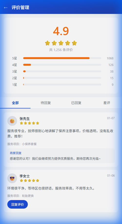 查看和回复用户评价,监控店铺口碑,处理差评申诉。