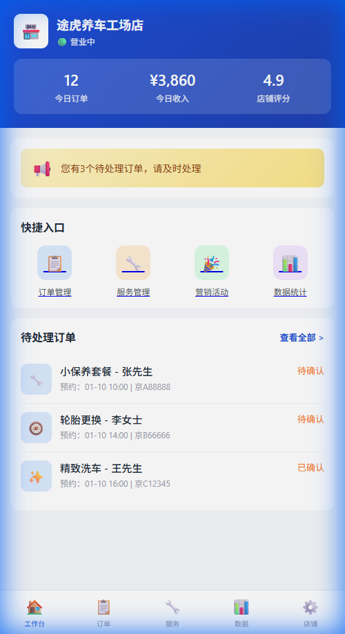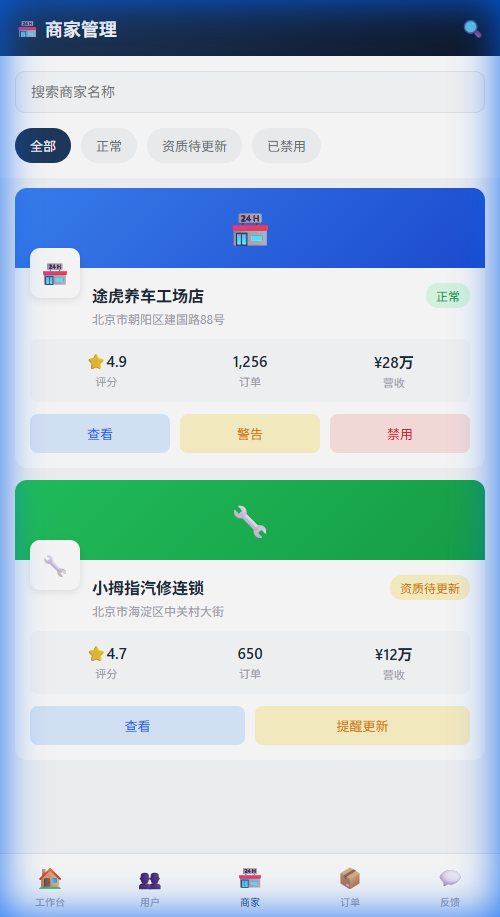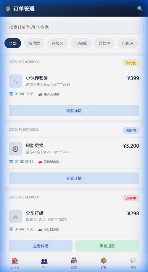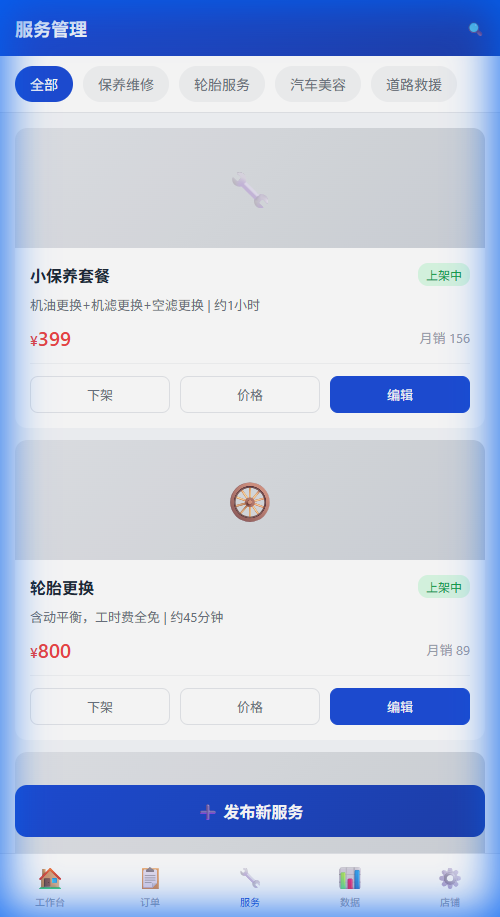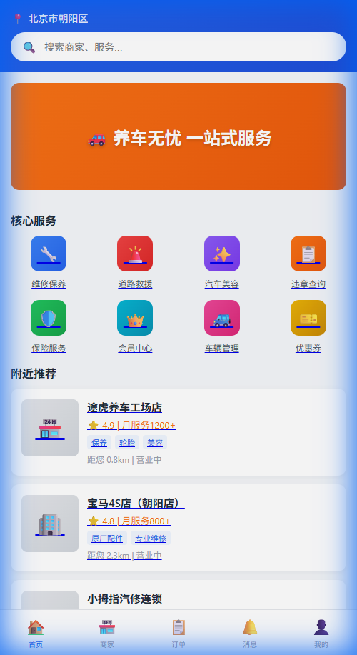 【汽车后市场服务平台】是一款面向车主、汽车服务商家和平台管理员的一站式汽车服务应用。平台整合了维修保养、道路救援、汽车美容、违章查询、保险服务等核心功能,为车主提供便捷、透明、优质的汽车后市场服务体验。