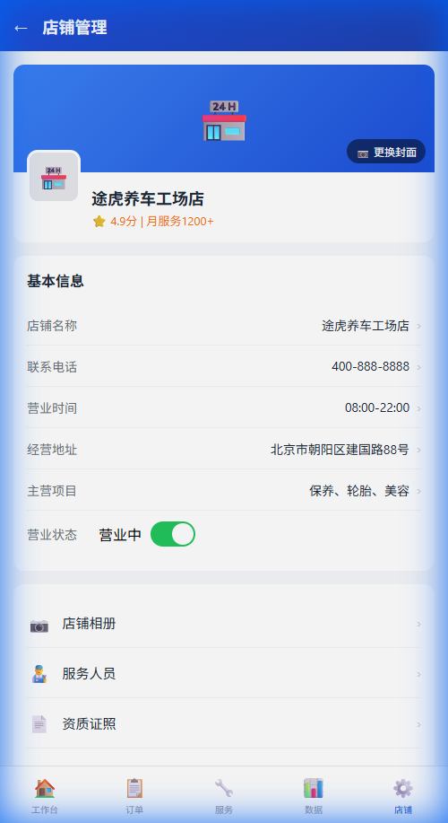 店铺基本信息编辑,包括店铺名称、地址、营业时间、联系方式等。