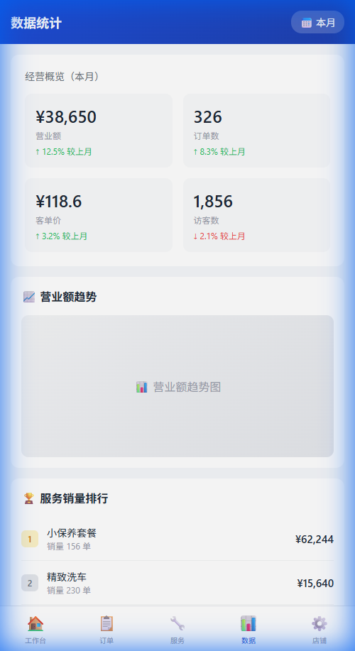 │ 数据统计 │ 营收分析、订单趋势、客户画像 │