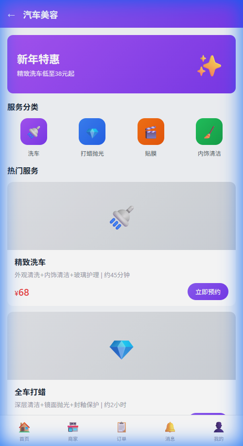 汽车美容服务分类展示,包括洗车、打蜡、贴膜、内饰清洁等服务项目,支持在线预约。