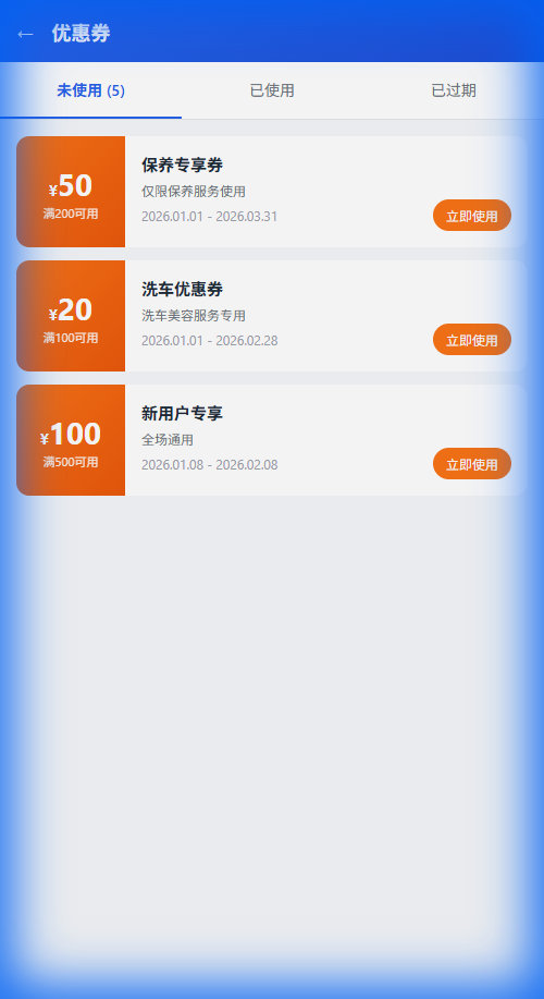 用户优惠券列表,分类展示可用、已使用、已过期优惠券,支持领取新券。