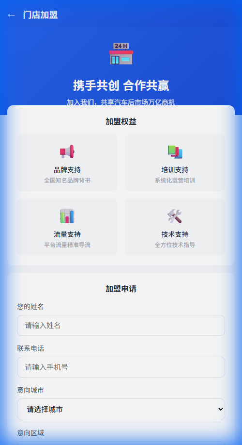 面向意向加盟商的推广页面,展示品牌优势、加盟政策、联系方式等信息。