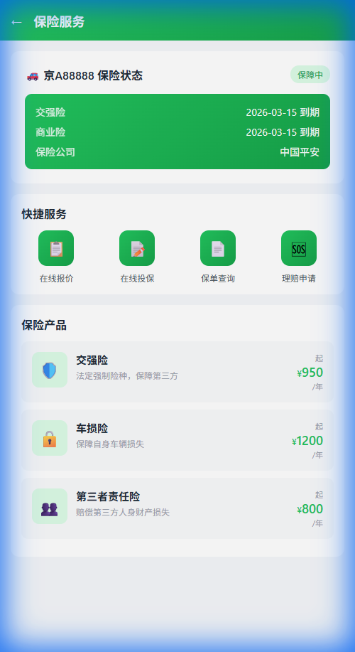 汽车保险服务模块,提供保险报价、续保提醒、理赔服务等功能。