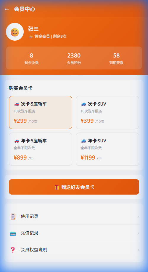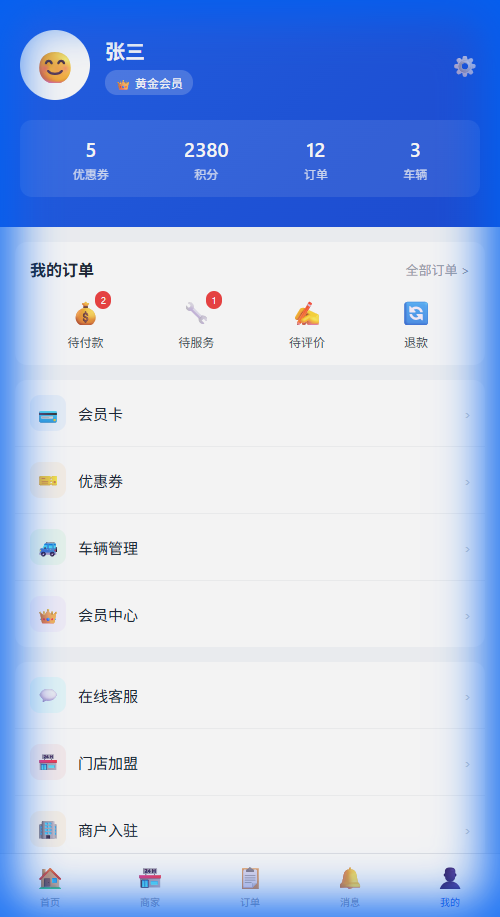 │ 用户中心 │ 个人资料、车辆管理、订单管理、优惠券、消息中心 │