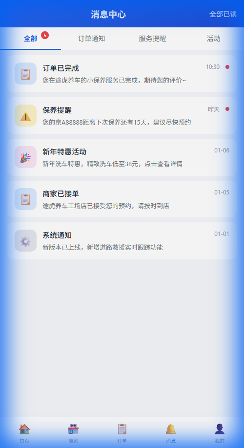 系统通知、活动消息、服务提醒等消息类型分类展示。