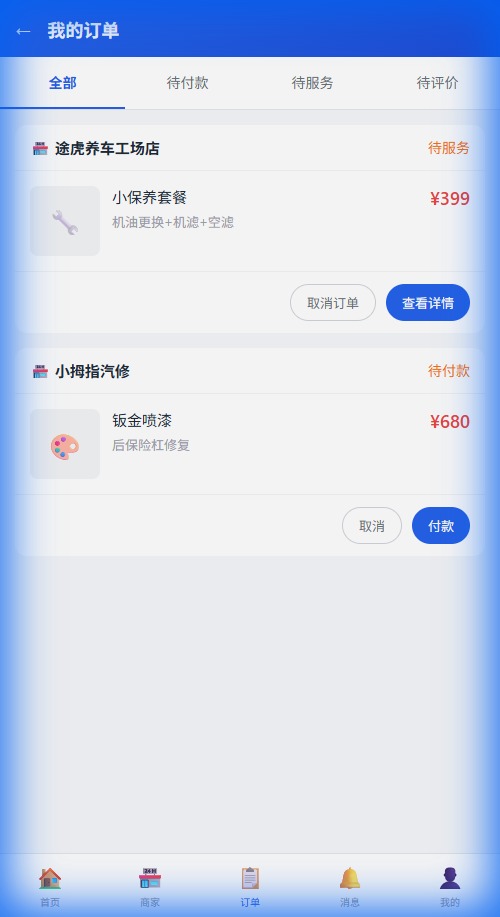 用户订单列表,支持按状态筛选(全部、待付款、待服务、已完成),展示订单详情和操作按钮。