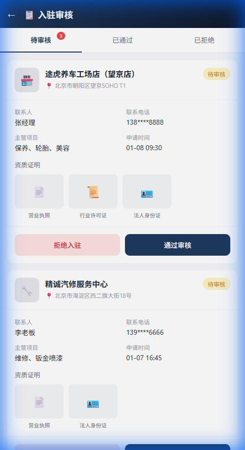 商家入驻申请审核,查看申请资料,进行审批操作(通过/驳回)。