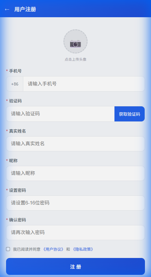 新用户注册页面,收集手机号、验证码、密码等基本信息,引导用户完成账号创建。