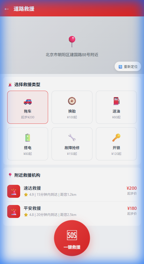 紧急救援服务入口,提供拖车救援、搭电服务、换胎服务、送油服务等多种救援类型。基于地图定位快速呼叫附近救援服务。