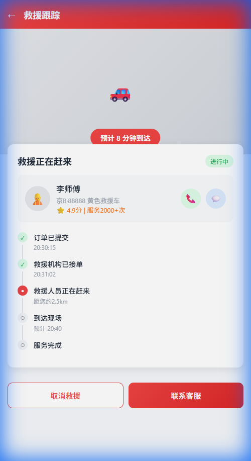 实时追踪救援进度,显示救援人员信息、预计到达时间、救援状态流程。