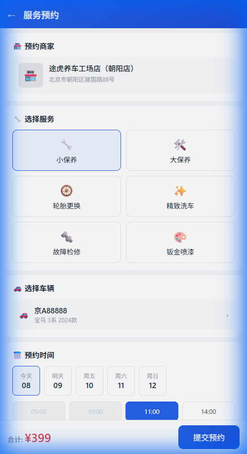 用户选择服务项目、预约时间、确认车辆信息的核心流程页面。
