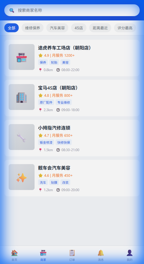 展示附近汽车服务商家,支持按距离、评分、服务类型筛选。每个商家卡片显示店铺图片、名称、评分、服务标签、距离等关键信息。