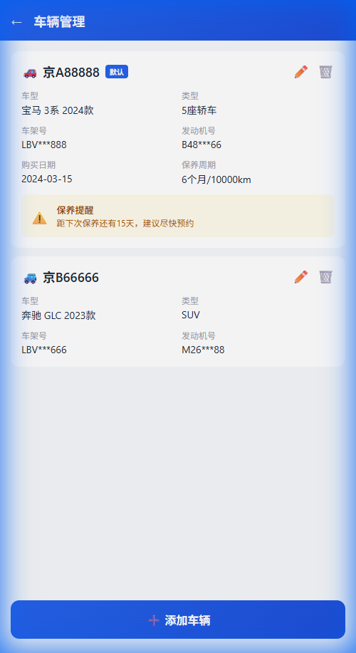 用户车辆信息管理,支持添加、编辑、删除车辆,记录车牌号、品牌型号、行驶里程等信息。