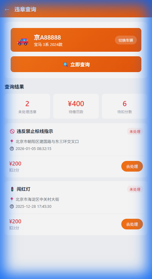 车辆违章信息查询,显示违章记录、扣分情况、罚款金额,支持在线缴费。