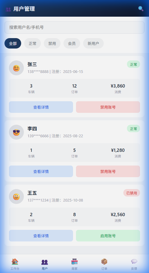 平台用户列表,支持搜索、筛选,查看用户详情,管理用户状态(正常/禁用)。