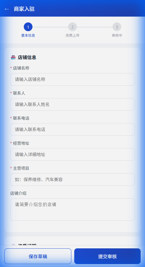 商家入驻资料填写页面,收集店铺信息、经营资质、联系方式等审核所需材料。
