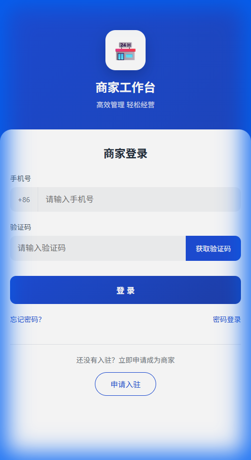 商家专属登录入口,支持账号密码登录,提供忘记密码、申请入驻入口。