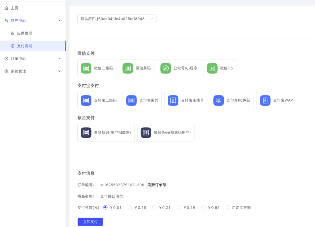 商户中心:应用管理、支付测试、支付配置。