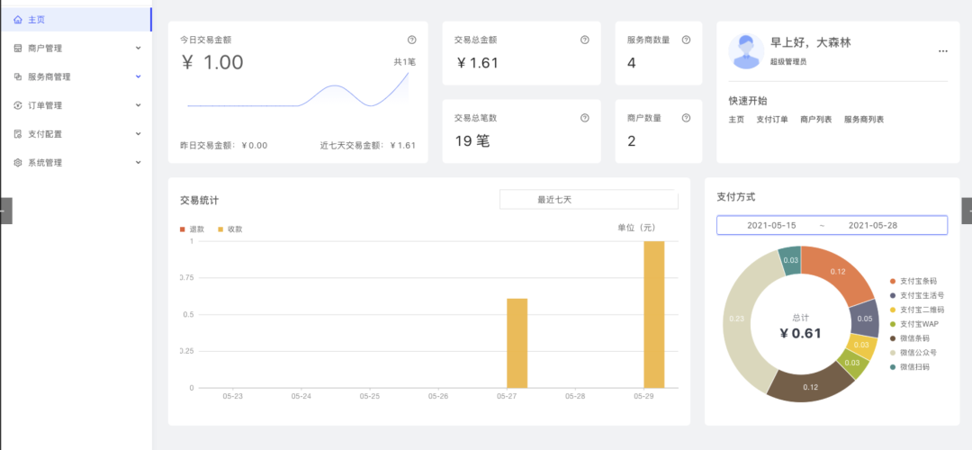 主页: 今日交易数据、昨日交易数据、近七日交易数据、服务商数量、商户数量 、快速开始、支付方式。